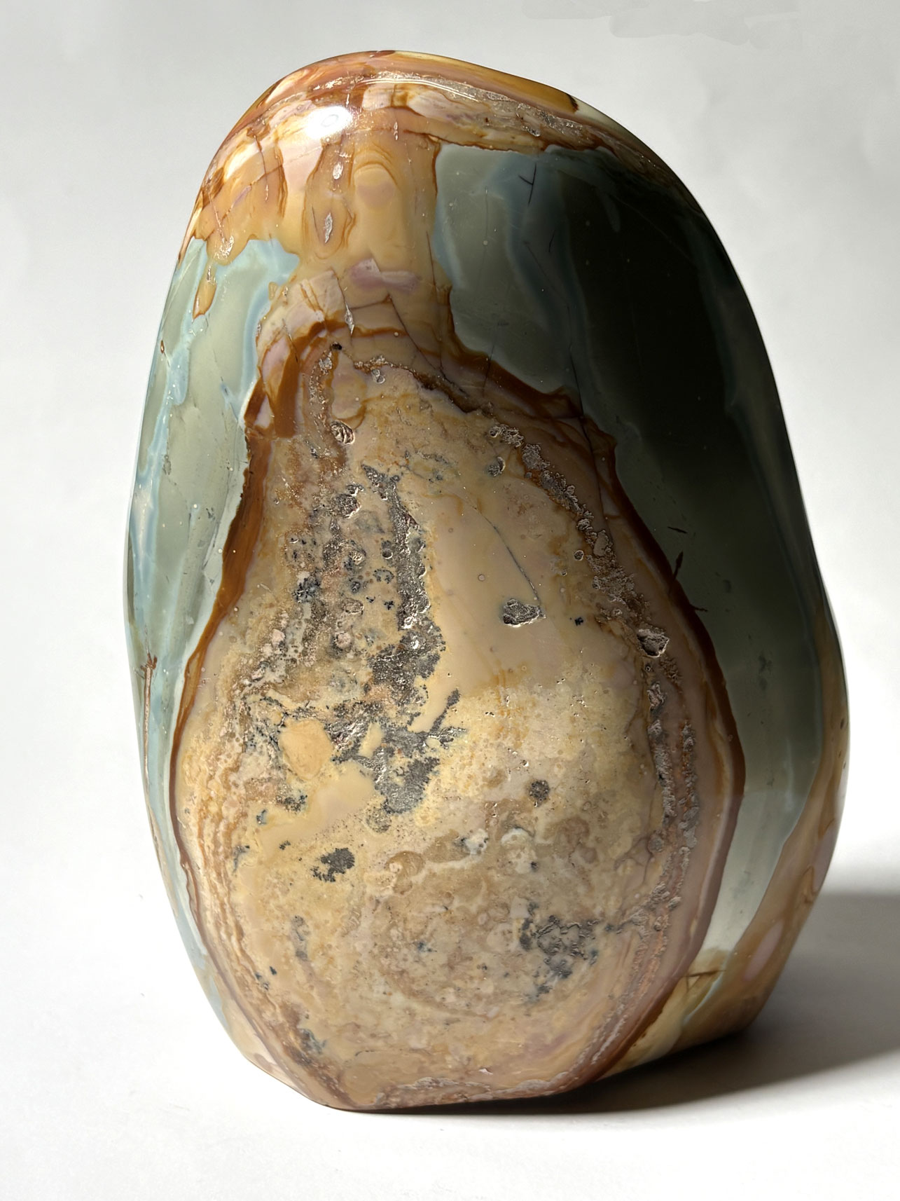 Le jaspe polychrome malgache se forme dans des environnements volcaniques et sédimentaires, où des solutions riches en silice se déposent et s’imprègnent d’impuretés minérales, donnant naissance à ces motifs complexes.