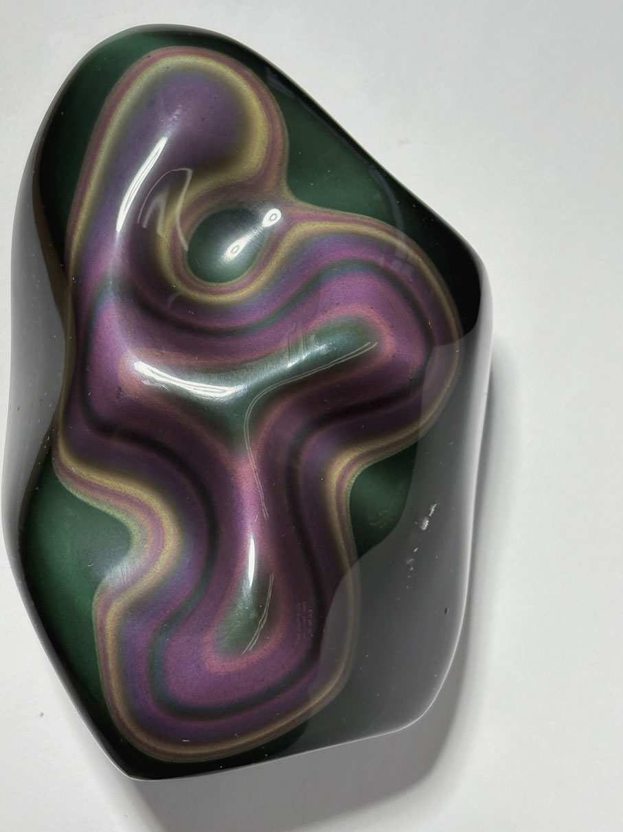 Les effets “œil” résultent de micro-inclusions et de couches internes (nanocristaux, bulles de gaz étirées, particules riches en fer) organisées en structures sphérulitiques lors du refroidissement rapide de la lave rhyolitique. Ces structures provoquent des phénomènes d’interférence lumineuse donnant des irisations vertes, dorées, violettes ou bleutées.