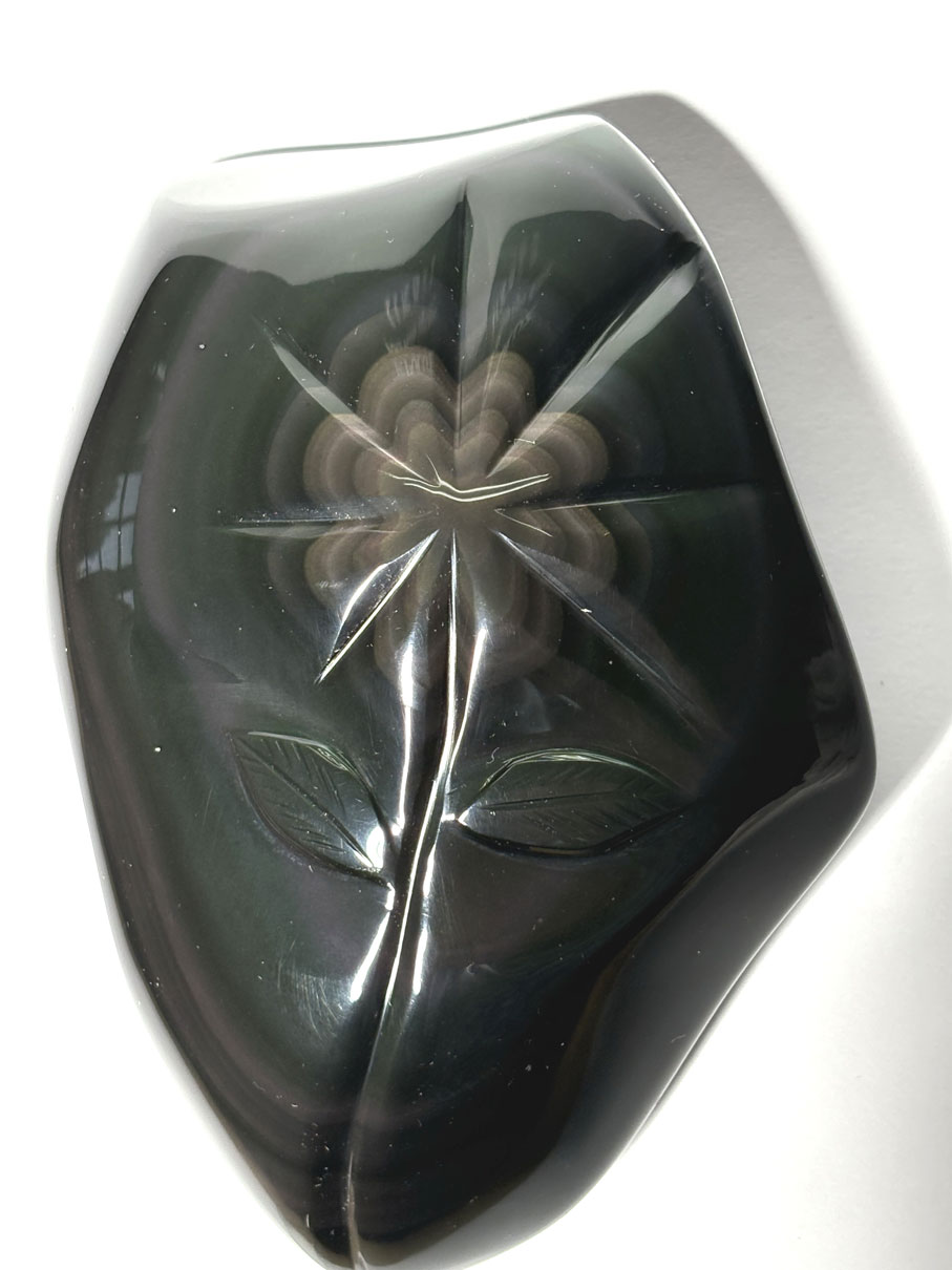 L’obsidienne œil céleste est une variété d’obsidienne noire présentant des reflets concentriques irisés, visibles en lumière directe après polissage. Comme toute obsidienne, il s’agit d’un verre volcanique naturel riche en silice (≈70–75 % SiO₂), de structure amorphe (sans cristallisation).