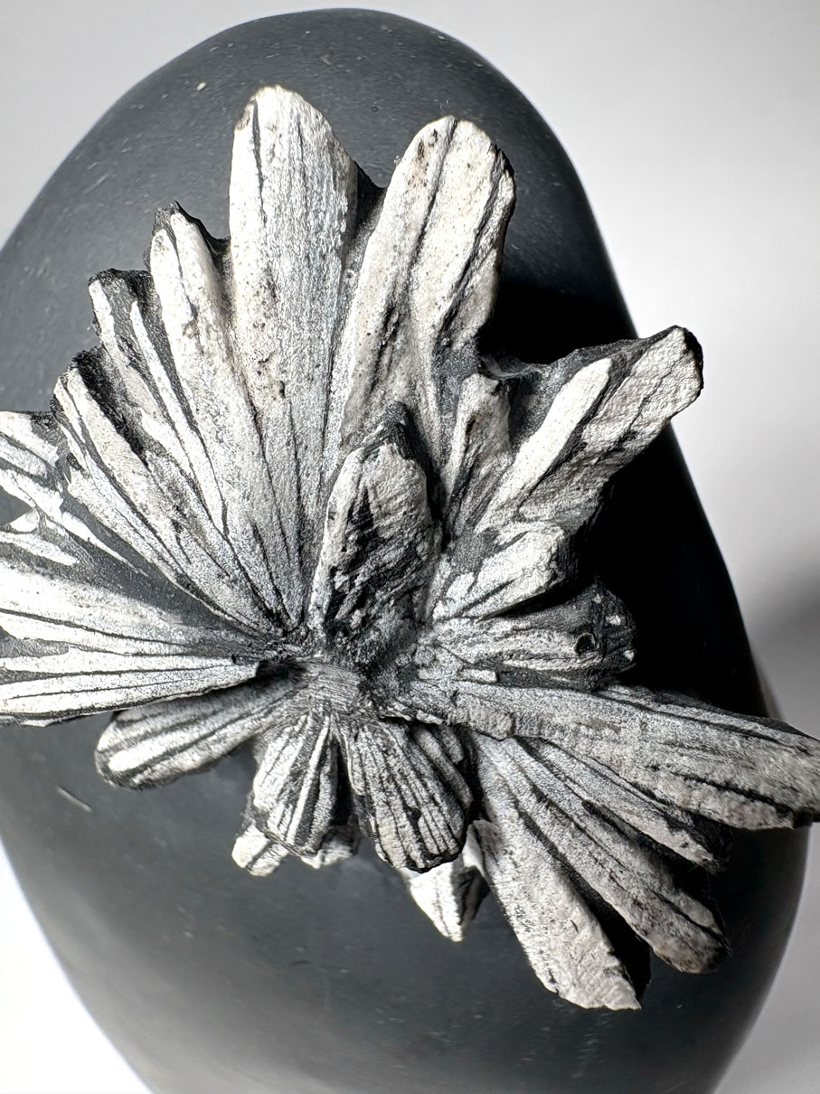 La célestine est un sulfate de strontium cristallisant dans le système orthorhombique, formant des agrégats fibreux ou prismatiques. Dans cette roche, elle croît radialement à partir d’un point central, créant le motif floral caractéristique par contraste de couleur (blanc à gris clair sur fond noir).