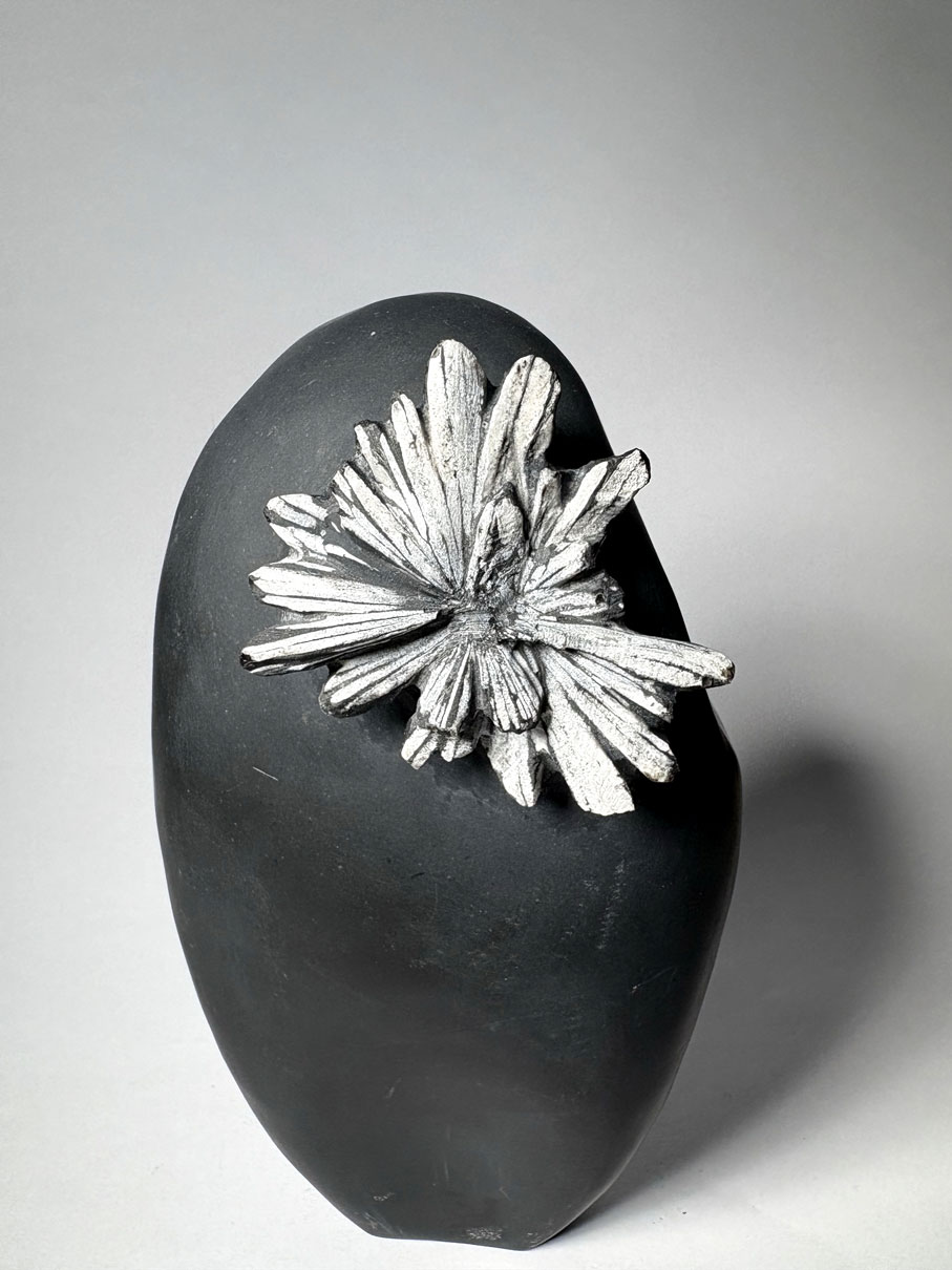 La « pierre chrysanthème » est une roche ornementale composée d’une matrice calcaire ou dolomitique sombre contenant des cristallisations radiales claires évoquant une fleur. Les “pétales” sont généralement constitués de célestine (SrSO₄), plus rarement de calcite ou d’andalousite selon les gisements.