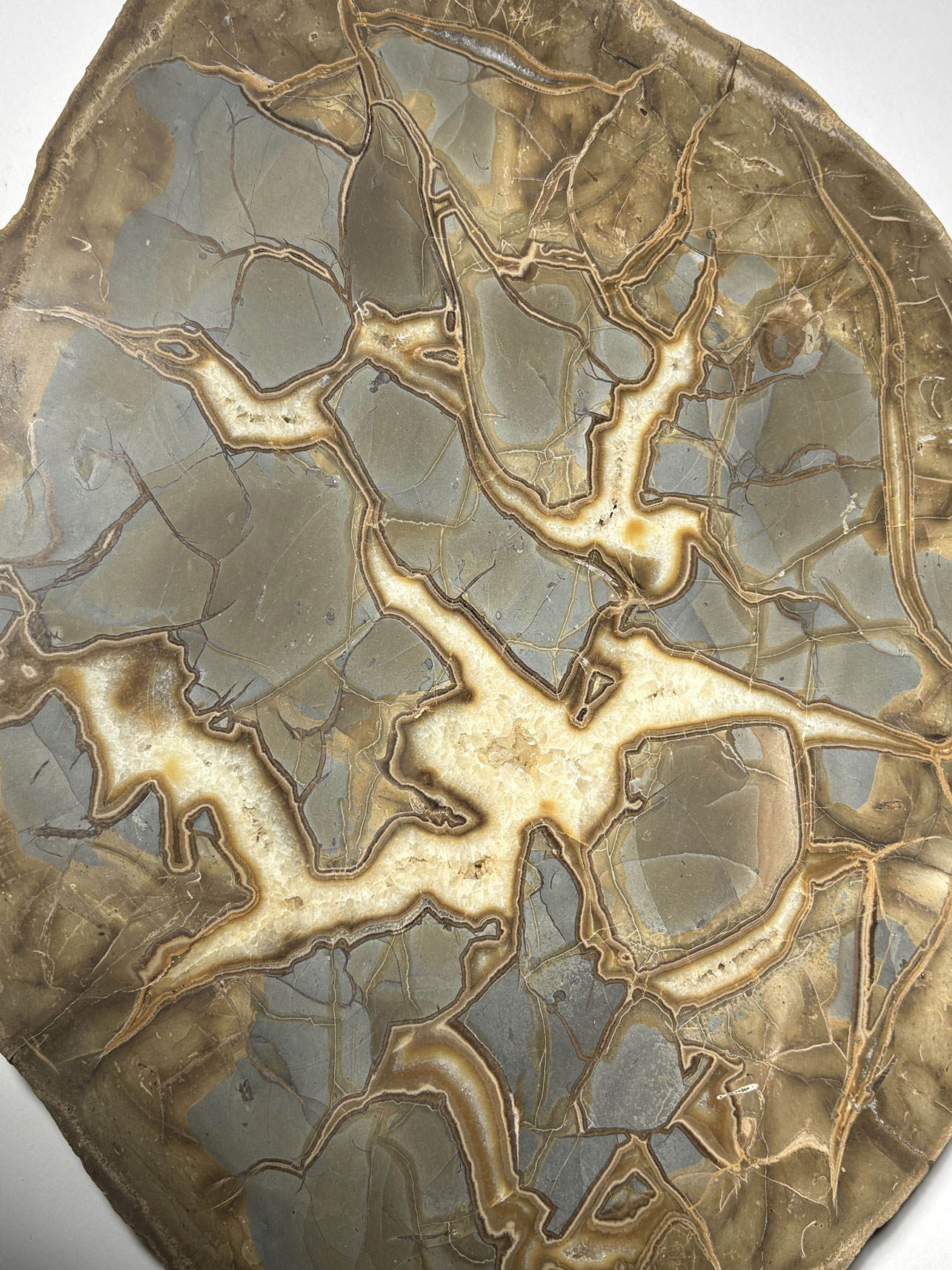En section polie, elles montrent un contraste net entre la matrice sombre et les veines calcitiques claires, révélant la géométrie des fractures de retrait.