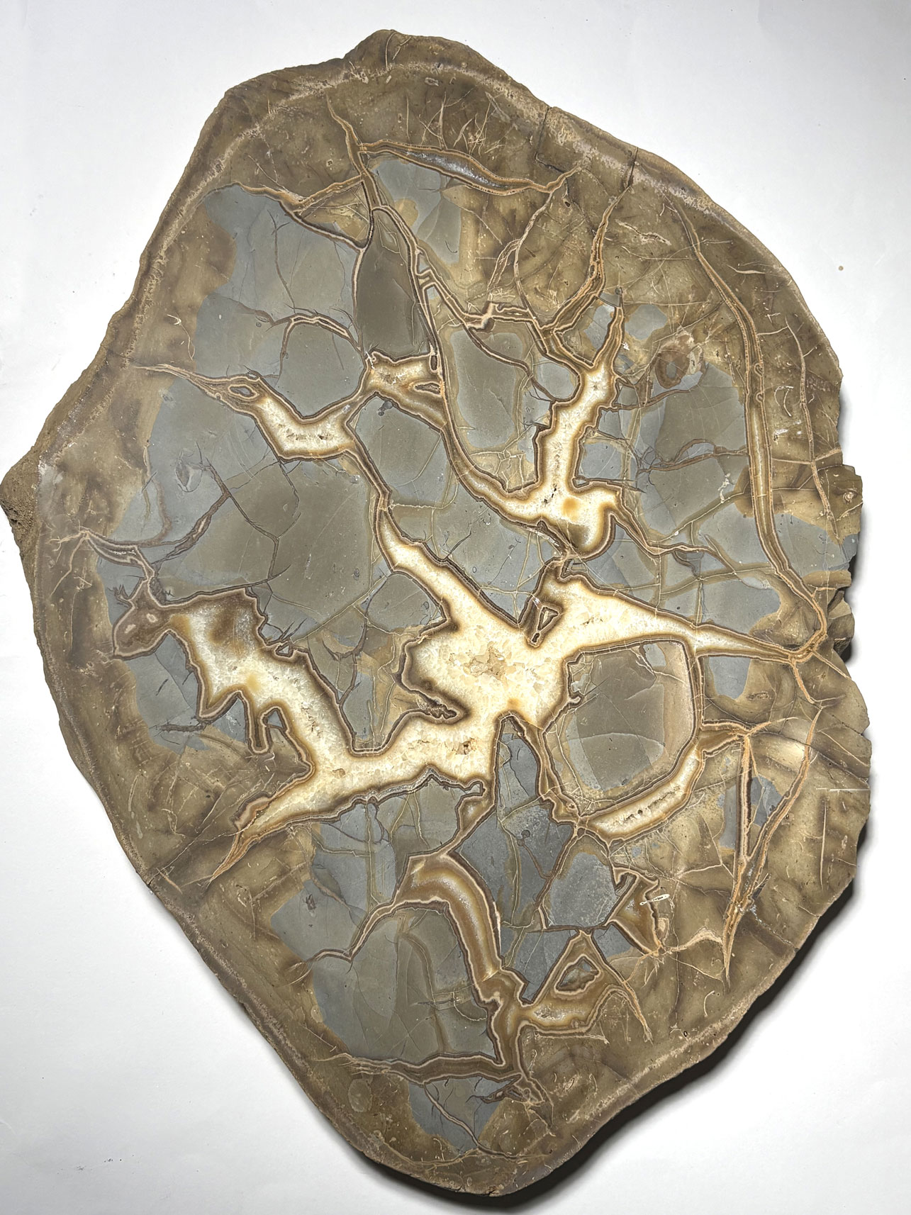 La formation débute par la précipitation d’un noyau calcaire dans une matrice argileuse meuble. Lors de la diagenèse (compaction et déshydratation), la concrétion se fissure en un réseau polygonal interne. Ces fractures sont ensuite remplies par des solutions riches en carbonate de calcium, cristallisant en calcite.