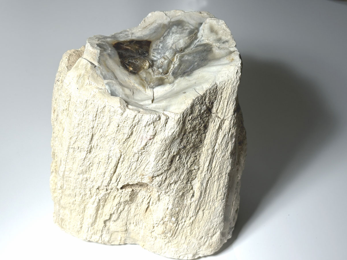 Le bois fossile de Garut (Indonésie) est un bois silicifié, résultant de la pétrification d’anciens arbres dans un contexte volcanique actif de Java. La matière organique a été progressivement remplacée par de la silice (SiO₂), principalement sous forme de quartz microcristallin (calcédoine), tout en conservant la structure anatomique du bois.
