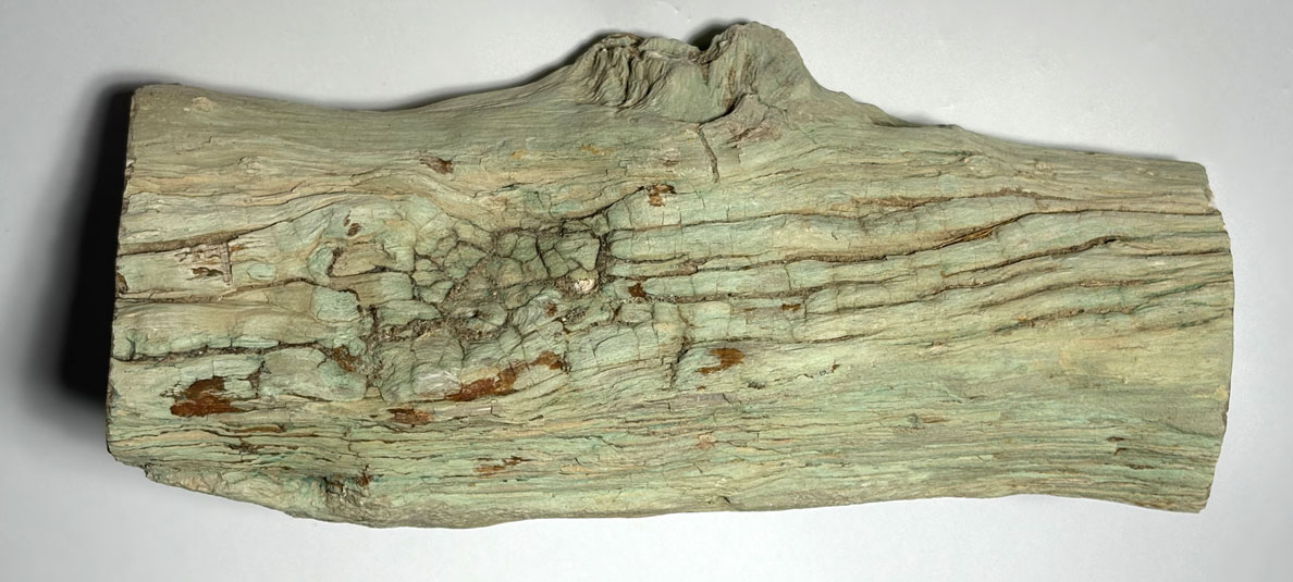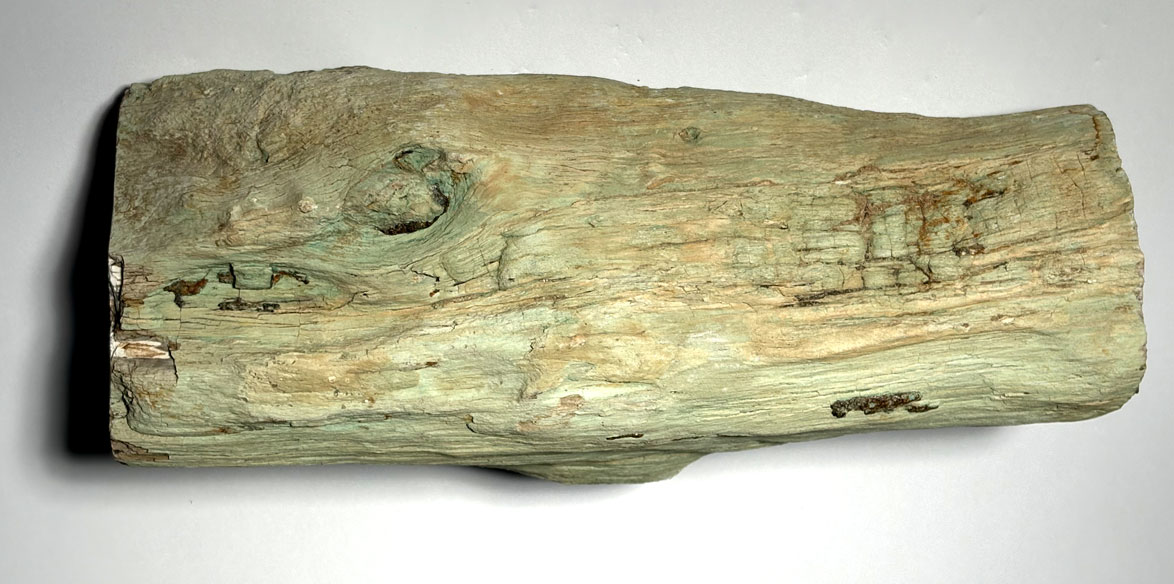 La teinte verte inhabituelle provient de la présence d’inclusions minérales riches en fer ferreux, chlorite ou autres silicates secondaires, incorporées lors de la circulation de fluides minéralisés durant la fossilisation. La structure cellulaire originelle du bois (fibres, cernes de croissance, vaisseaux) est souvent remarquablement conservée.