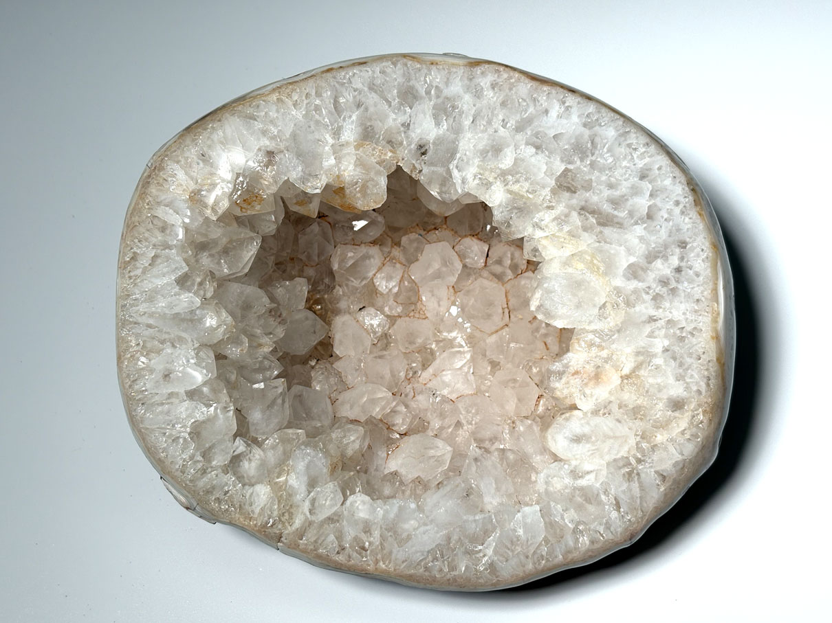 Une géode d’agate de Madagascar est une cavité rocheuse tapissée de calcédoine (SiO₂), souvent associée à du quartz cristallisé. Elle appartient aux tectosilicates et se distingue par ses bandes concentriques caractéristiques.