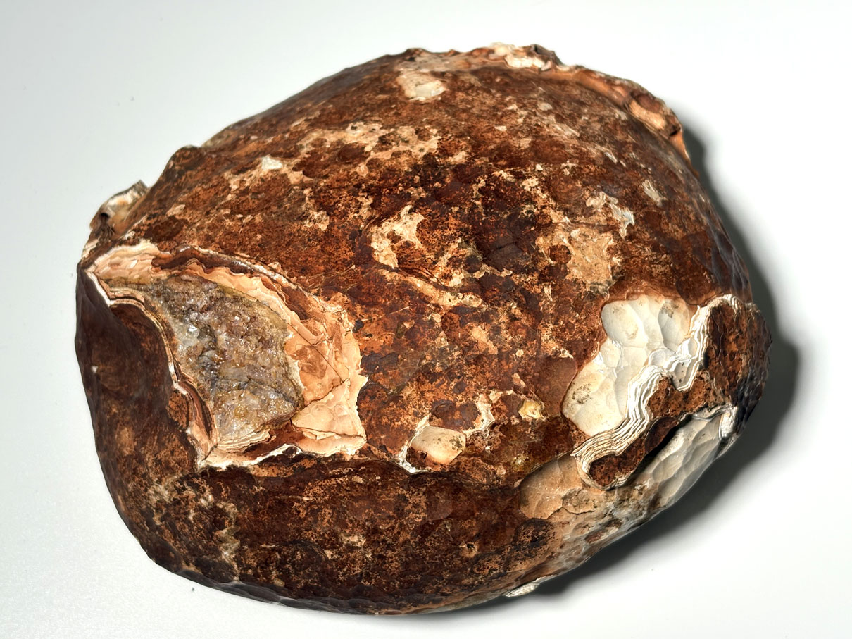 Les géodes se forment dans des roches volcaniques (souvent basaltiques). Des bulles de gaz emprisonnées dans la lave créent des cavités, ensuite remplies progressivement par des solutions riches en silice. Ces dépôts successifs donnent les bandes colorées typiques de l’agate. Parfois, le centre reste creux ou se tapisse de cristaux de quartz.