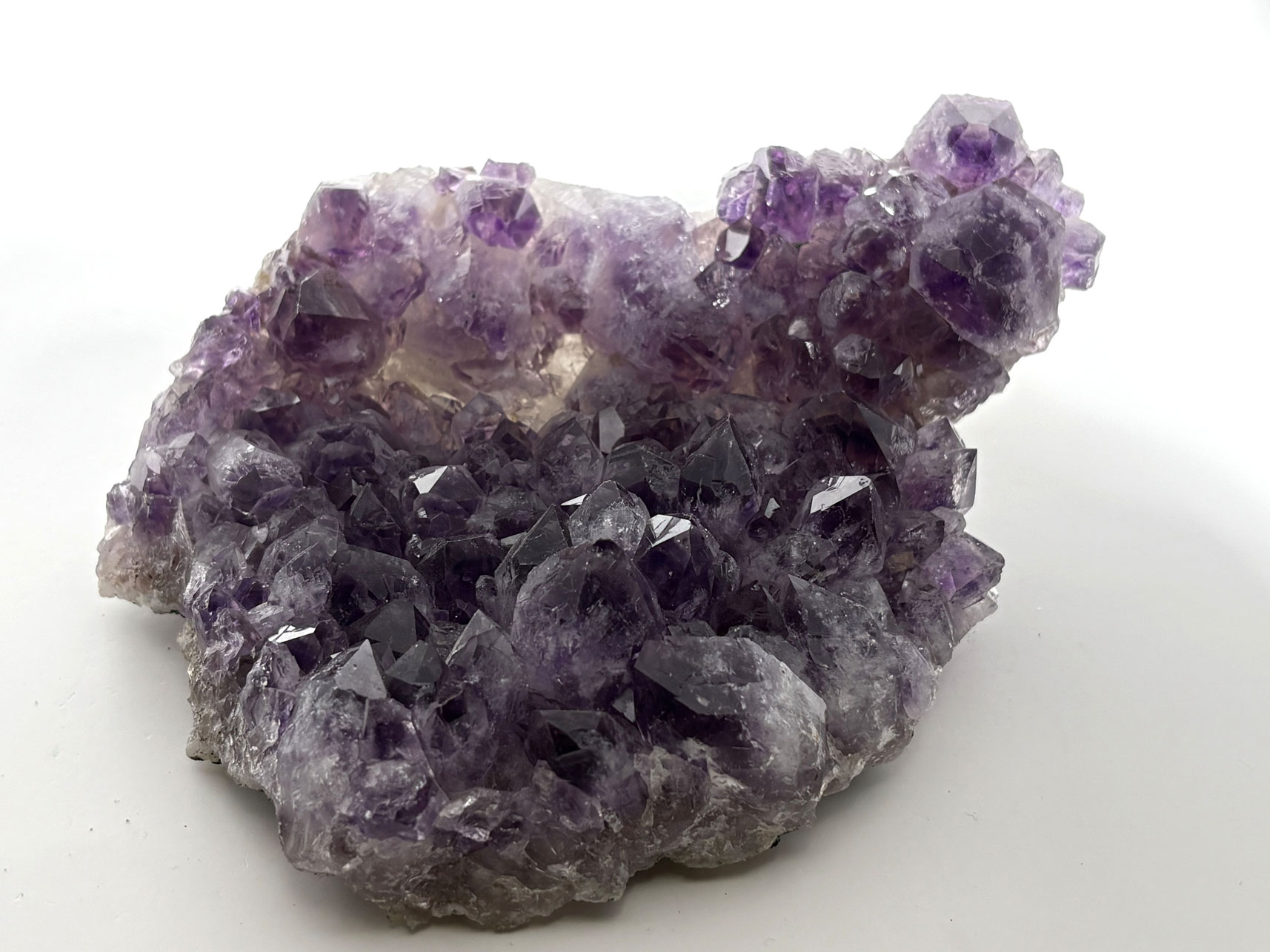 L’améthyste est une variété violette de quartz, de formule chimique SiO₂. Elle appartient à la classe des silicates, groupe des tectosilicates. Sa structure cristalline est trigonale (système cristallin rhomboédrique), caractéristique du quartz α, constituée d’un réseau tridimensionnel de tétraèdres SiO₄ liés par des atomes d’oxygène partagés.