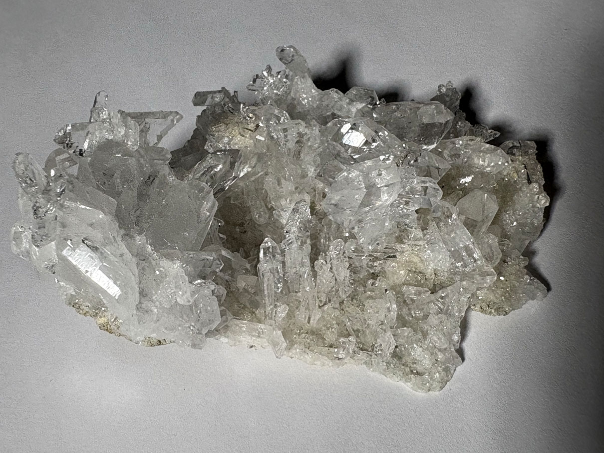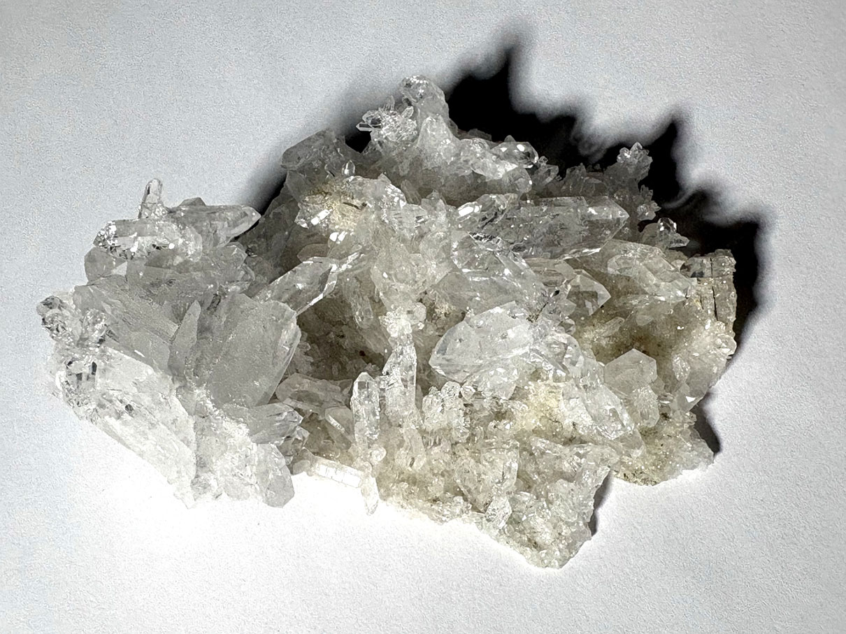 Le cristal de roche est la variété incolore et transparente du quartz, de formule SiO₂, appartenant aux tectosilicates. Il cristallise dans le système trigonal (quartz α), avec une structure constituée d’un réseau tridimensionnel de tétraèdres SiO₄ interconnectés.