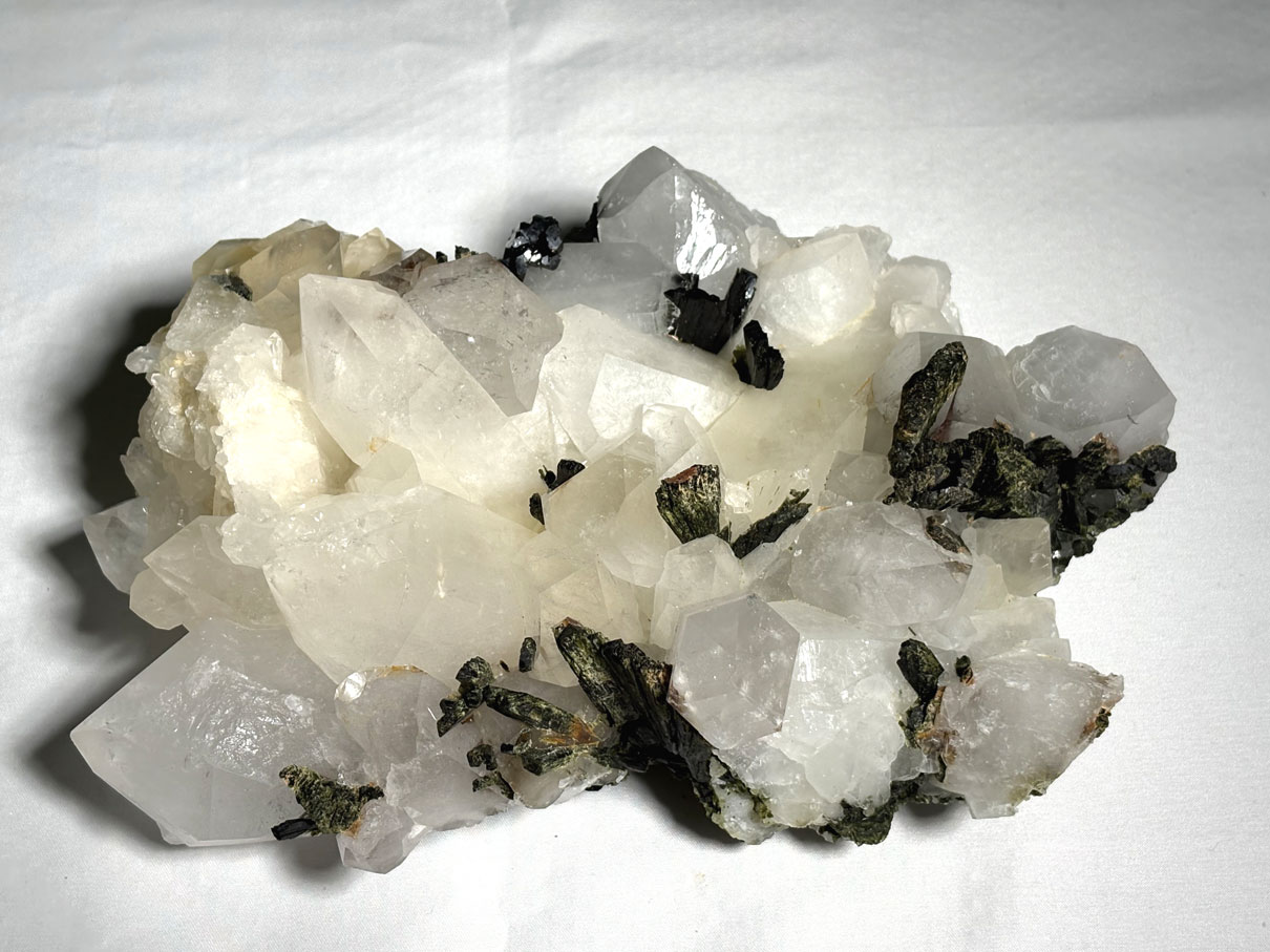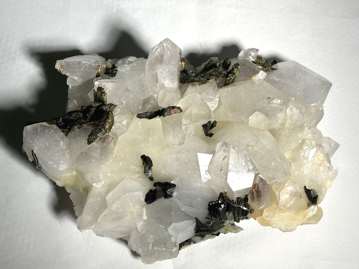 Cette combinaison offre un contraste marqué entre la transparence du quartz et la teinte verte intense de l’épidote, tout en témoignant d’un contexte géologique métamorphique complexe.