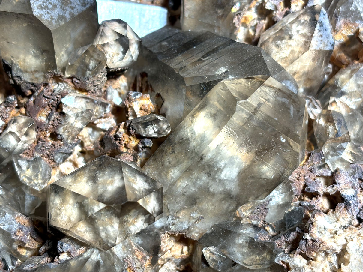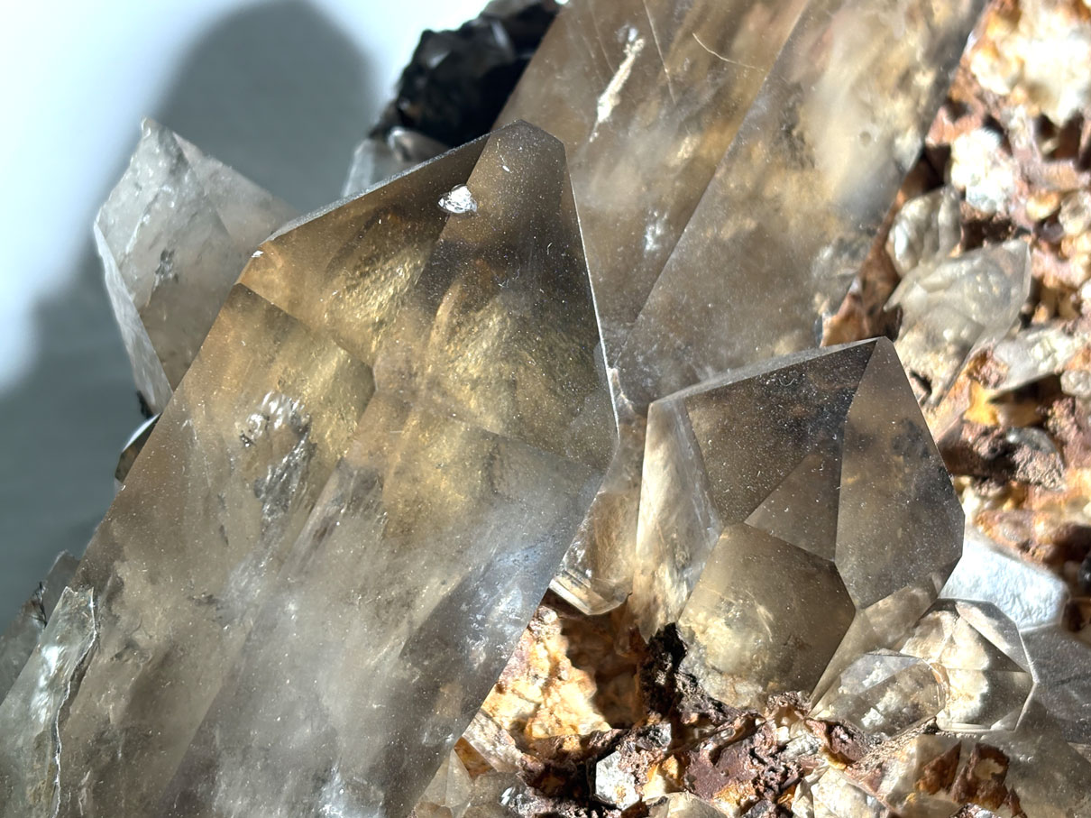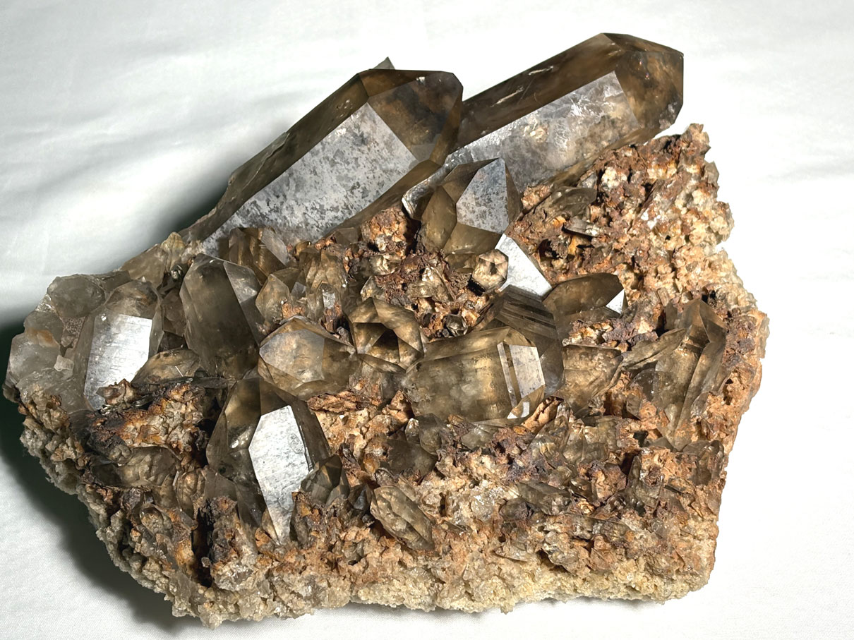Le quartz fumé est une variété de quartz (SiO₂) appartenant à la classe des tectosilicates, cristallisant dans le système trigonal. Sa teinte brun translucide à brun sombre est due à l’irradiation naturelle agissant sur des traces d’aluminium substituées au silicium dans le réseau cristallin, créant des centres colorés stables.