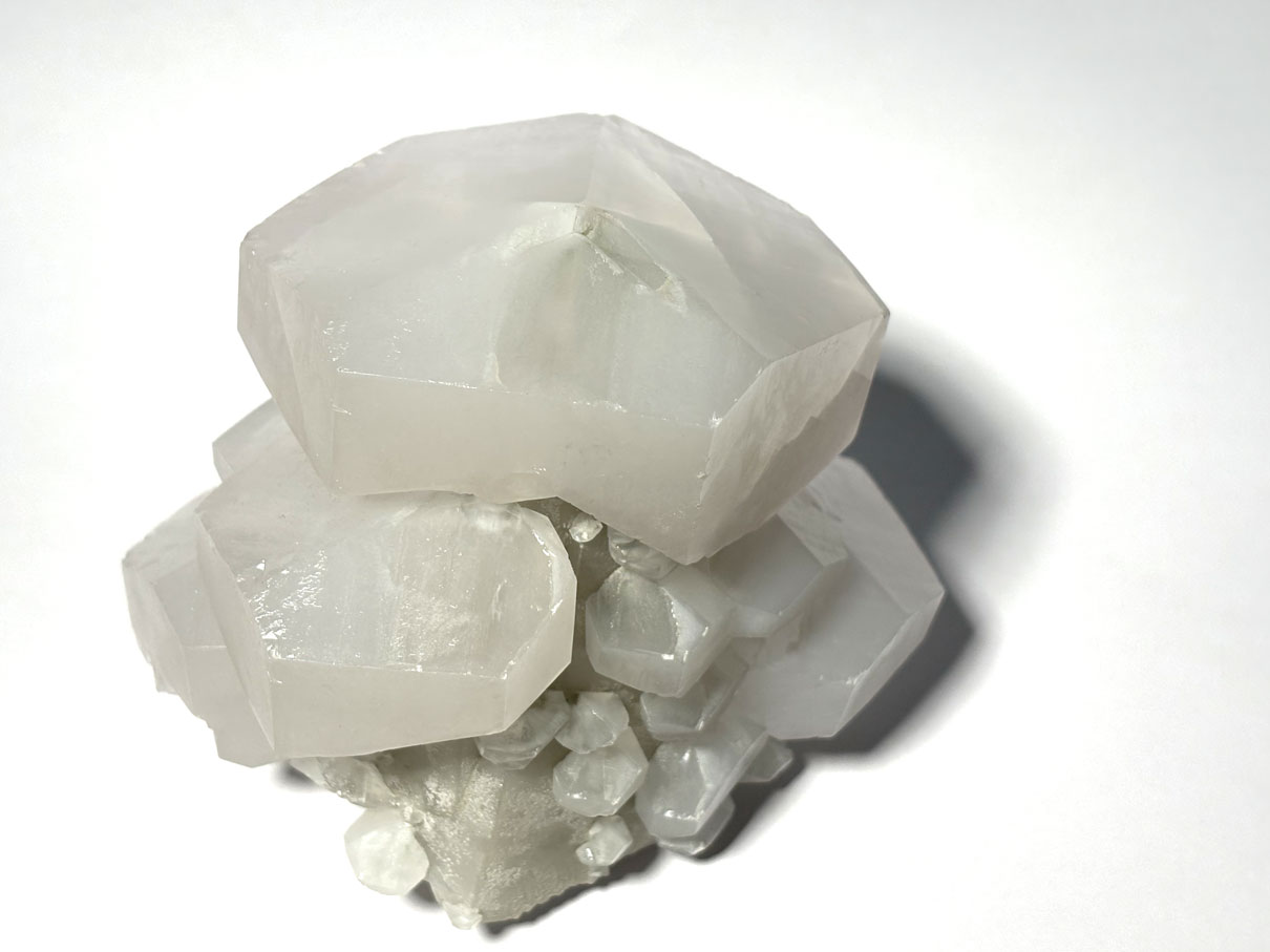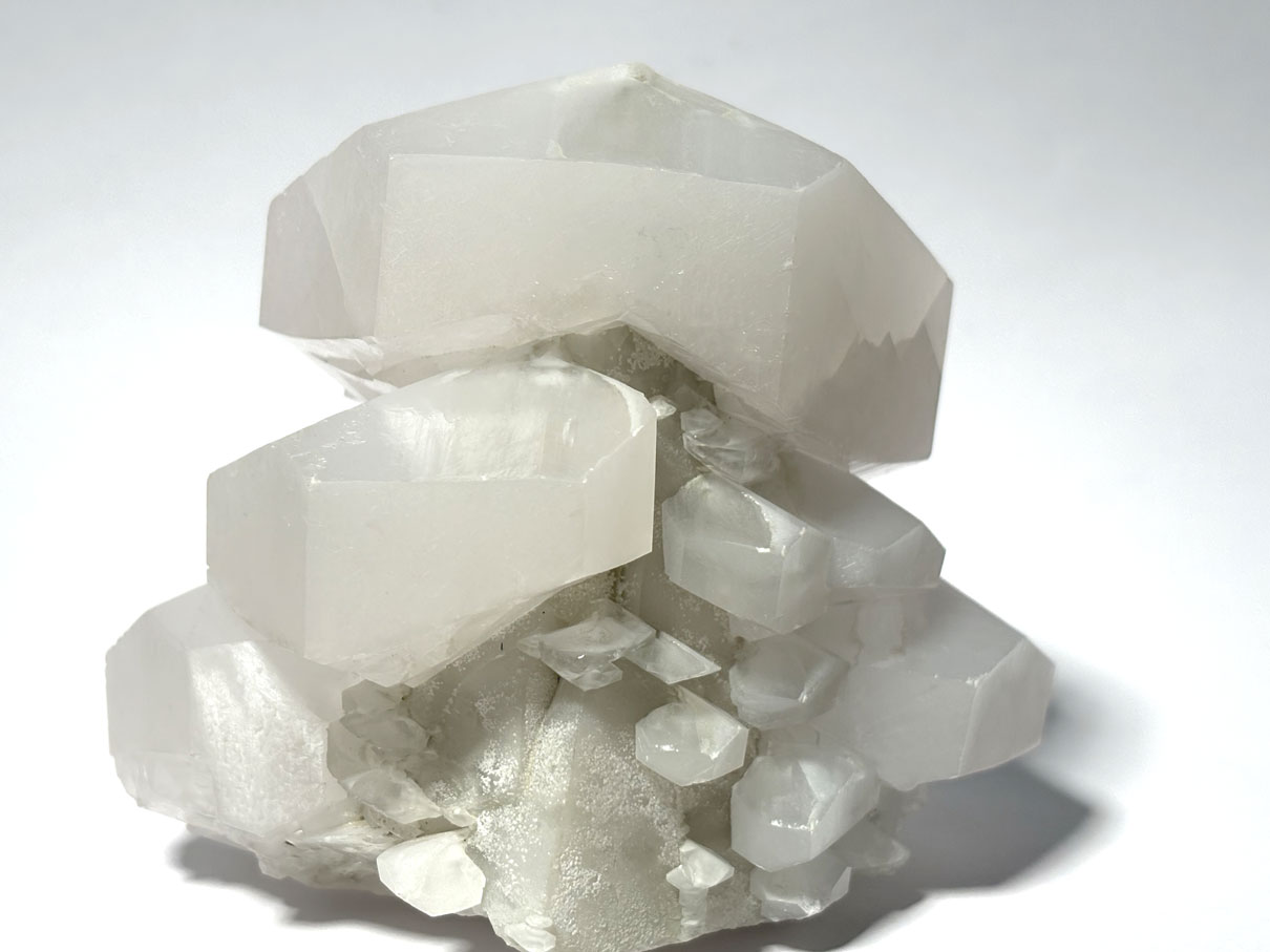 Les spécimens brésiliens présentent souvent des cristaux rhomboédriques, scalénoédriques (“dent de chien”) ou prismatiques, pouvant être incolores, blancs, jaunes, miel ou légèrement teintés selon les impuretés (Fe, Mn, etc.).