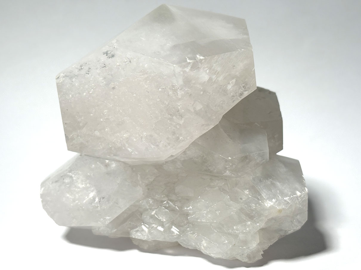 La calcite est un carbonate de calcium de formule CaCO₃, appartenant à la classe des carbonates anhydres. Elle cristallise dans le système trigonal (rhomboédrique). Sa structure est constituée d’ions Ca²⁺ coordonnés à des groupes carbonate (CO₃)²⁻ plans, organisés en empilements réguliers responsables de son clivage parfait.