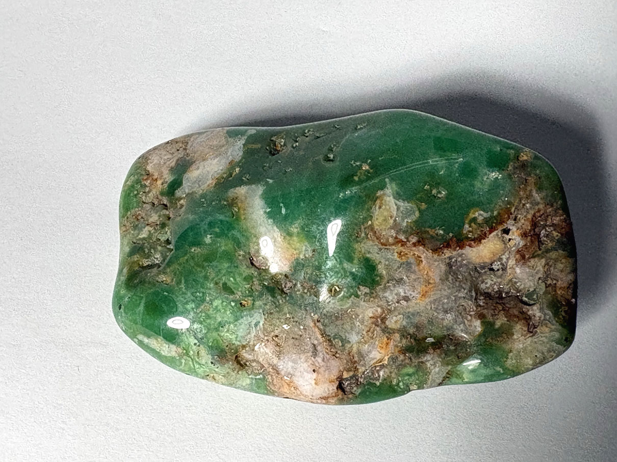 En Australie, la chrysoprase se forme dans des dépôts hydrothermaux sur roches serpentines ou ultramafiques, où les fluides riches en silice et en nickel favorisent la précipitation de la silice microcristalline.
