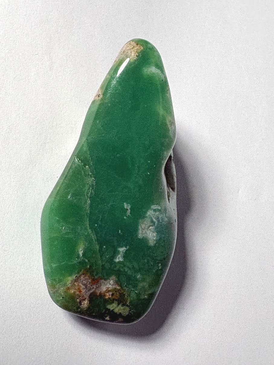 La chrysoprase est une variété de calcédoine (SiO₂ microcristallin) du groupe des quartz, enrichie en nickel, qui lui confère sa couleur vert pomme à vert intense. Elle appartient aux tectosilicates et se présente souvent en massifs compacts ou en nodules, parfois en concrétions dans les roches siliceuses.