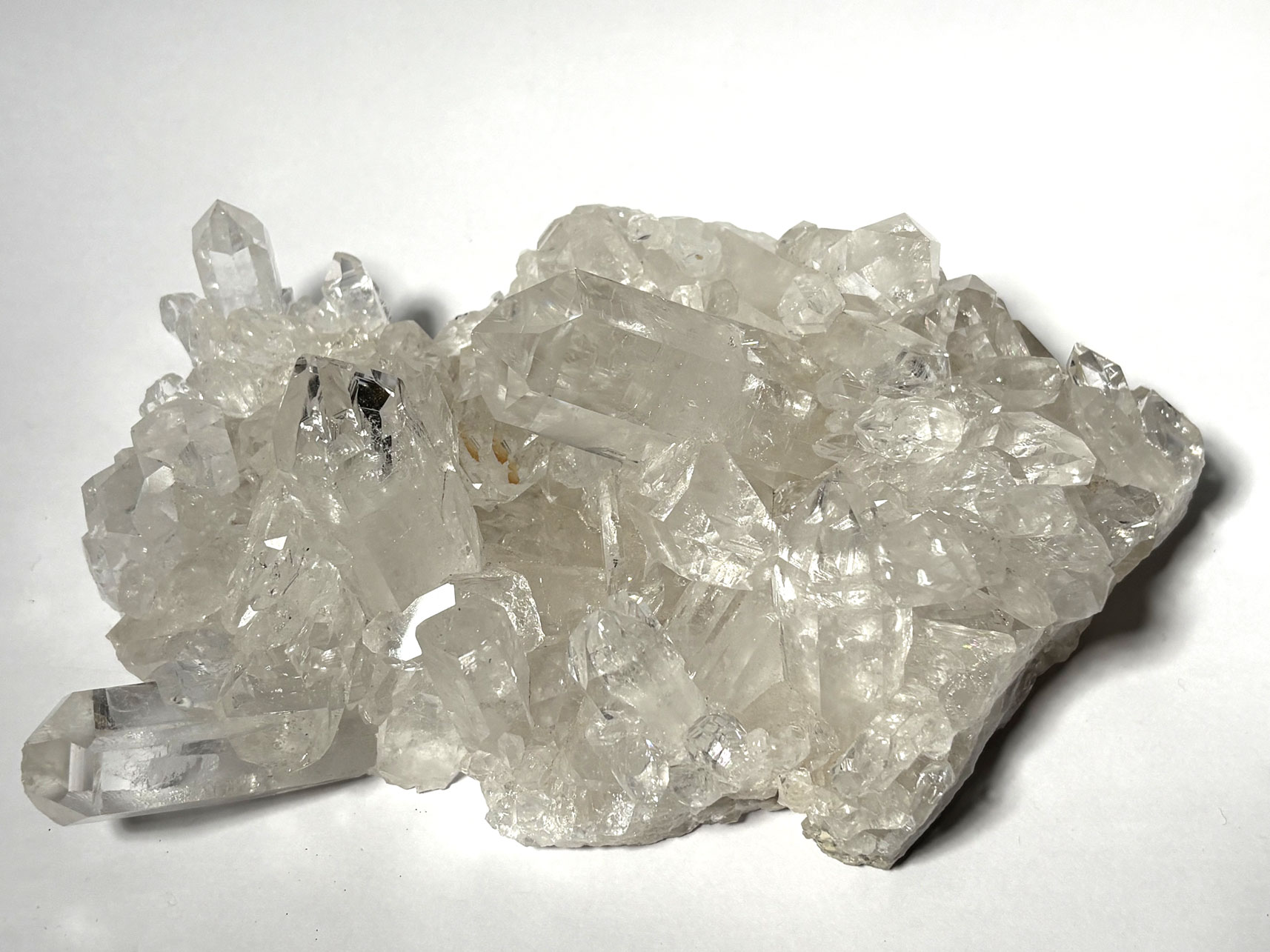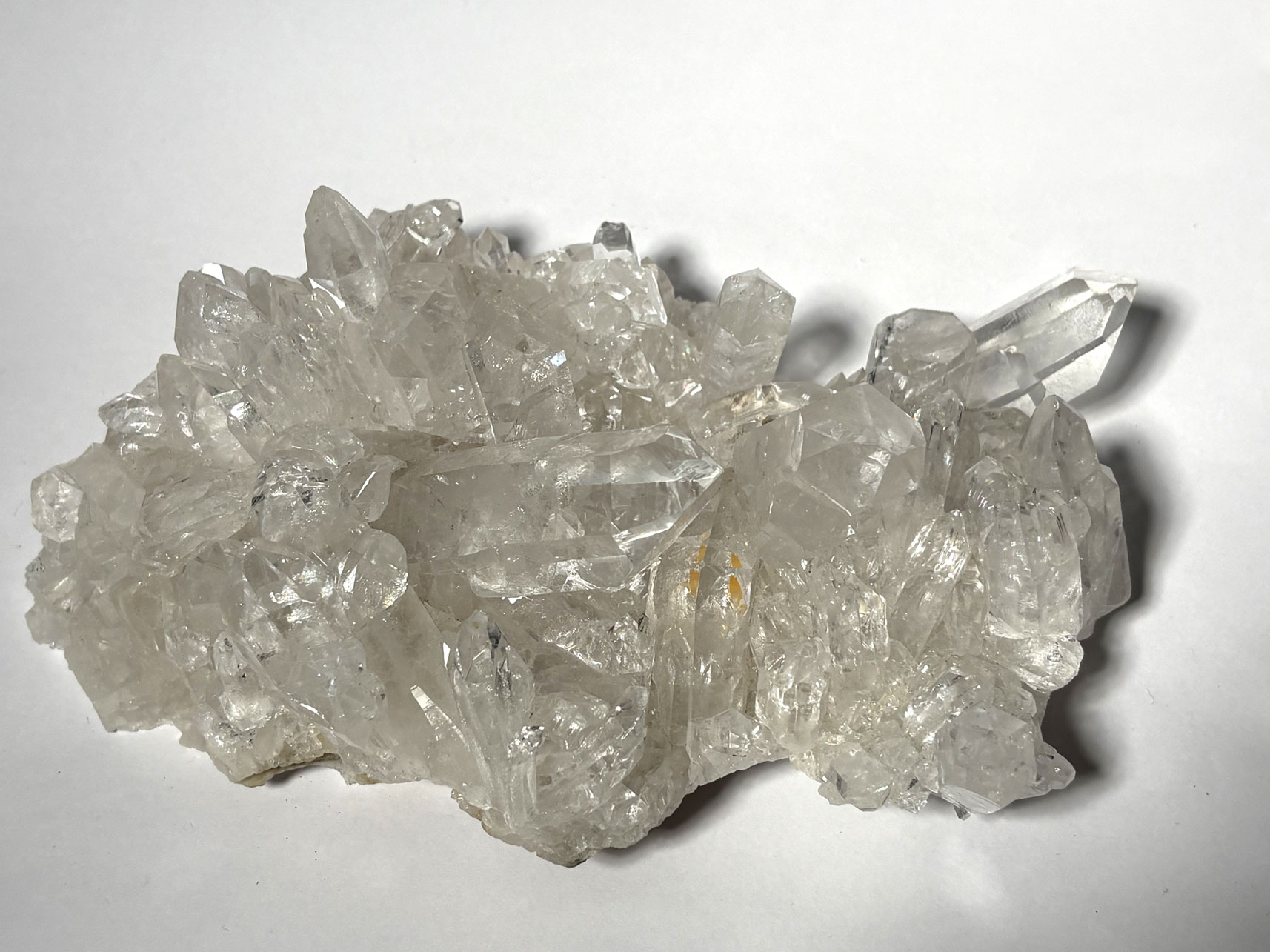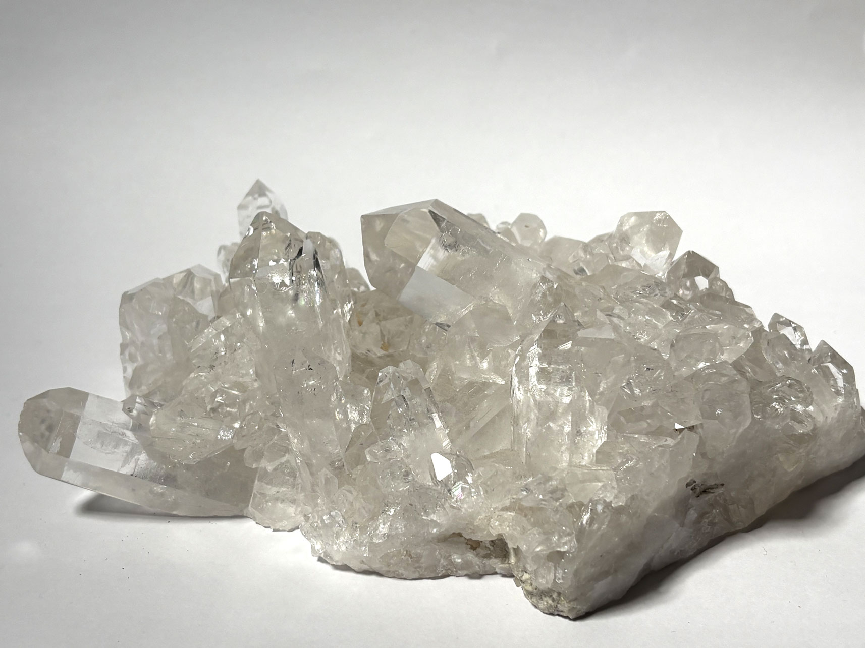 Le cristal de roche est la variété incolore et transparente du quartz, de formule SiO₂. Il appartient à la classe des tectosilicates et cristallise dans le système trigonal (famille hexagonale). Sa structure est constituée d’un réseau tridimensionnel de tétraèdres SiO₄ liés par des atomes d’oxygène partagés, conférant une grande stabilité chimique.