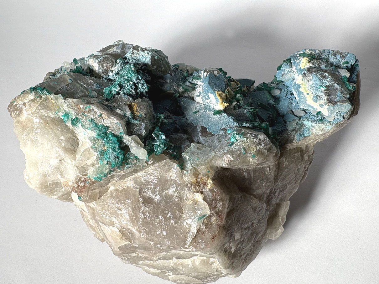 En République démocratique du Congo, la dioptase provient principalement de gisements cuprifères stratiformes de la région du Katanga. Elle se forme dans la zone d’oxydation des dépôts de cuivre, par interaction entre des solutions riches en silice et des minéralisations cuprifères en environnement aride à semi-aride.