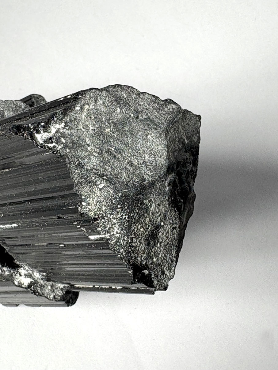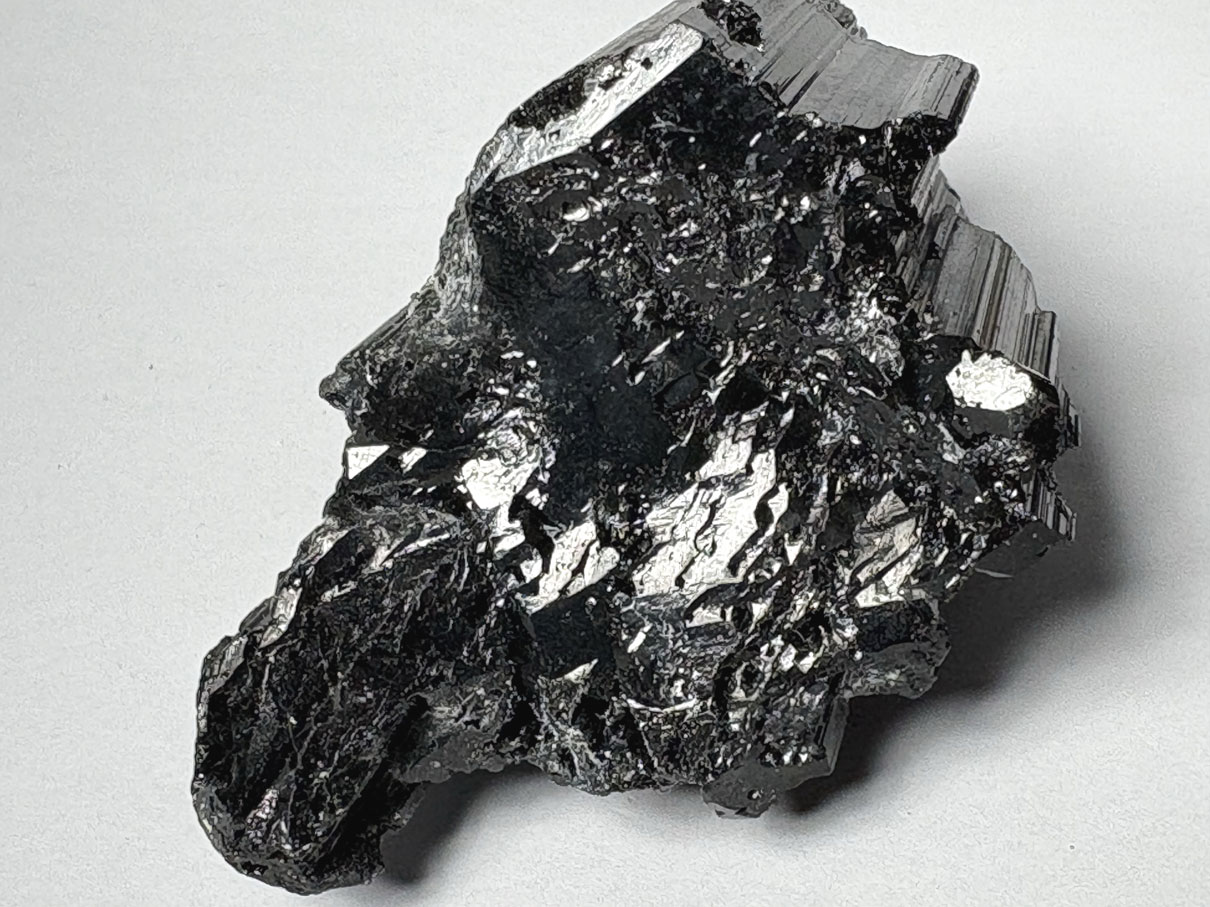 Elle se présente en cristaux prismatiques allongés, souvent striés longitudinalement, parfois massifs ou en agrégats radiés. Sa couleur est noir profond à brun noir, opaque.