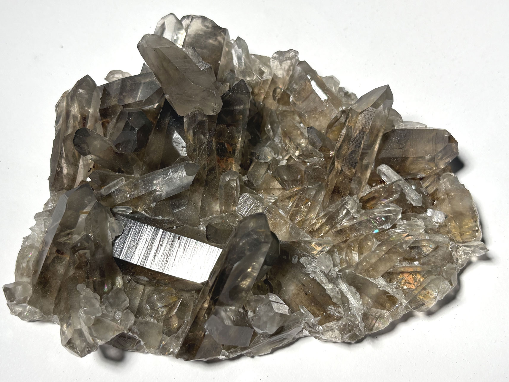 Sa teinte brun clair à brun foncé résulte de l’irradiation naturelle affectant des traces d’aluminium substituées au silicium dans le réseau cristallin. Cette irradiation génère des centres colorés responsables de l’aspect fumé, dont l’intensité dépend du degré d’exposition et de la concentration en aluminium.