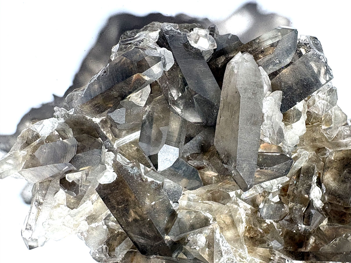 Le quartz fumé est une variété de quartz (SiO₂) appartenant aux tectosilicates et cristallisant dans le système trigonal (quartz α). Sa structure est constituée d’un réseau tridimensionnel continu de tétraèdres SiO₄.
